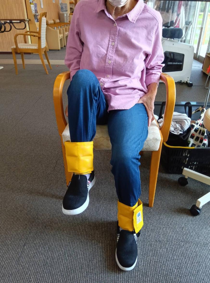 左の写真では、足に重りをつけて、下肢筋力のアップを目指しています。