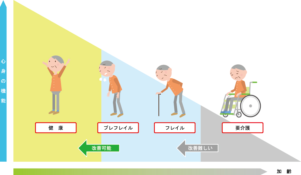 健康な状態と介護が必要な状態の間で、加齢により心身が衰えた状態。 早く気づいて適切な対応をすれば、健康な状態に戻ることができます。