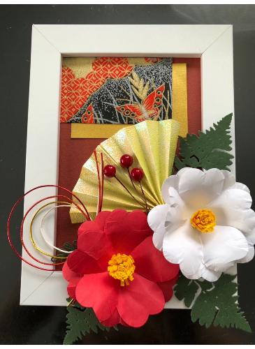 型抜きした紙で立体的な花々やパーツを作り、お正月を迎える華やかなアートフレームに仕上げましょう。