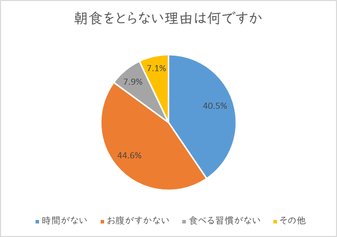 朝食をとらない理由の多くが、「時間がない」40.5%、「お腹がすかない」44.6%である。