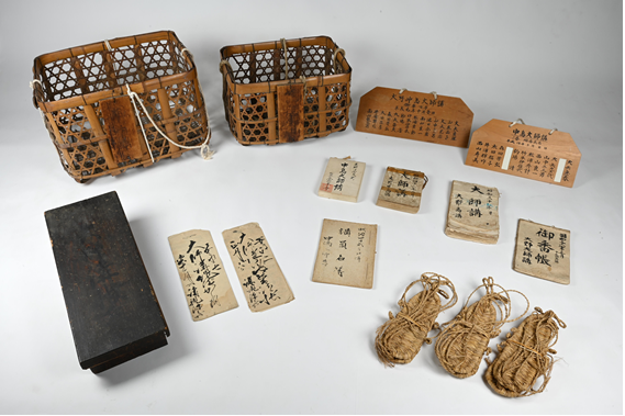 高野口町中島大師講では、講として所有する弘法大師の掛軸や『御番帳』など雑事登の記録、運搬に用いられた雑事籠が残り、近代の高野山と山麓集落の信仰の在り方を示す上で貴重な資料群です。