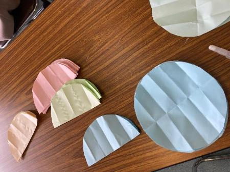まず、折り紙を20枚用意します。4つに折ってコンパスを使って弧を描き、はさみで切りとります。これを三つ折りにし、広げると折り線がきれいに入った円ができます。