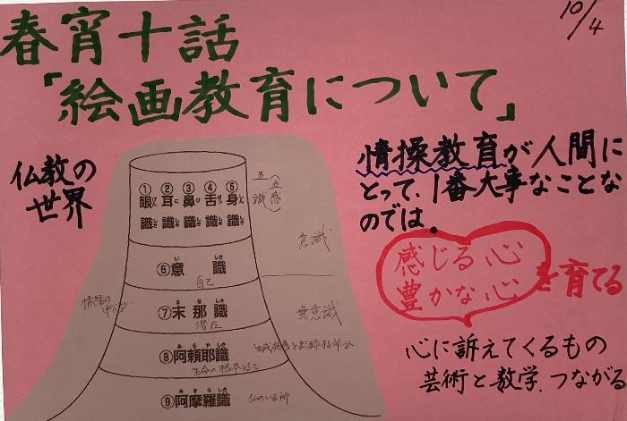 『春宵十話』p82~p88を朗読の後、博士の言う絵画教育の重要性・必要性について話し合われました。数学と絵画教育、一見つながりにくそうだが、博士の言う情緒を耕すためには情操教育が必要で、「本物にふれること、本物を見ること、さわること、聞くことで情操豊かな心を育てられるのだ。」つまり、「感じる心を養うこと」が大事なんだと。・・・色々な話がなされました。