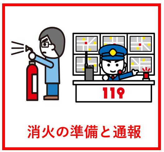 その間に消火器の準備、119番通報をしてください。