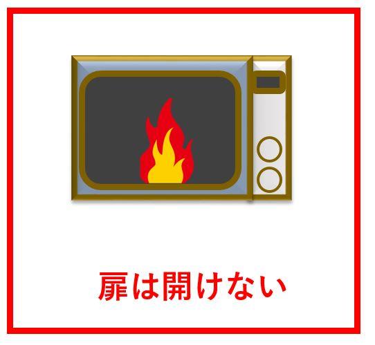 慌てて電子レンジの扉を開けると、外から酸素が供給されて炎の勢いが増したり、火傷する危険があります!!