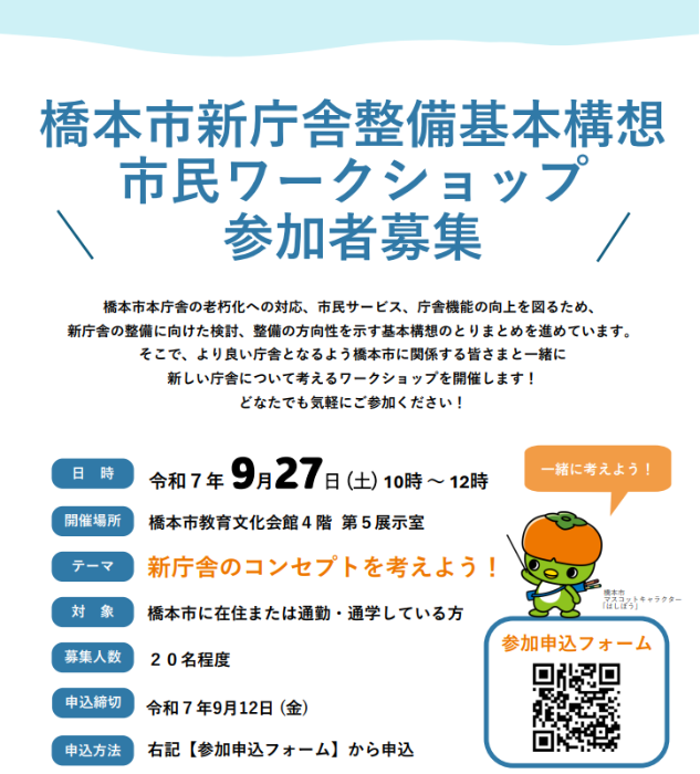 橋本市役所庁舎の老朽化への対応、市民サービス、庁舎機能の向上を図るため、新庁舎の整備に向けて、より良い庁舎となるように市民の皆様と一緒に考えるために、ワークショップを開催します。
