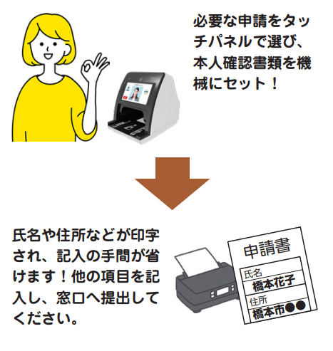 市役所窓口での申請書の作成に必要となる住所・氏名・生年月日などの基本情報について、マイナンバーカードや運転免許証などから読み取り、印字されるようにする「申請書作成支援システム」を導入します。
