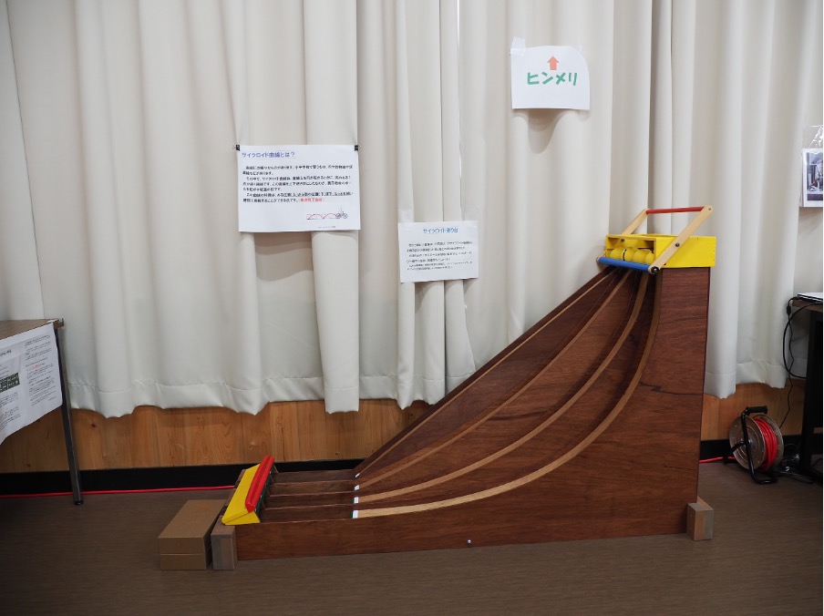 子どもたちに大人気なのが、このボール転がし装置。「直線」と「カーブ(サイクロイド曲線など)」、頂上から同時にボールを転がすと、どのコースのボールが先にゴールすると思いますか?
