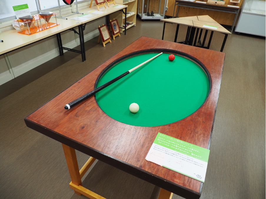 こちらは不思議なビリヤード台。実はこれ、だ円の形をしているんです。ある印(焦点)の場所にボールを置いて打つと……?壁に当たったボールは、必ずもう一つの印(焦点)にあるボールに命中するんです!適当に打ってもボールに当たっちゃう不思議な感覚に、小さなお子さんも夢中で何度もチャレンジしているそうですよ!