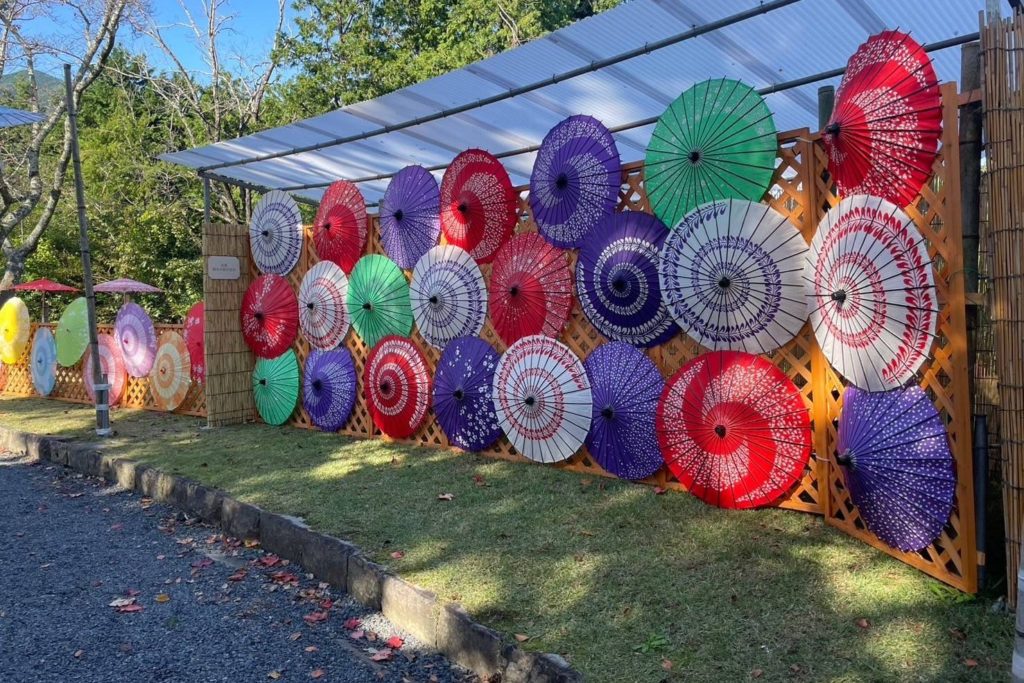 「焼きたてのピザ」を食べ、杉村公園で「はたごんぼコロッケ」を頬張りながら、和傘彩る菊花展を楽しむ充実したコースです。