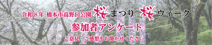 高野口公園桜まつり 令和8年4月5日(日曜日)、桜まつりを開催します🌸 ステージイベントや宝さがし、お菓子まきなど楽しいイベントが盛りだくさん!お楽しみに✨ 桜の名所として知られる高野口公園を中心としたイベントを開催します! 3月23日(月曜日)~4月5日(日曜日)は夜間点灯も行いますので夜桜も見に来てください。 橋本市高野口公園桜まつり実行委員会 公式インスタグラムはこちら この投稿をInstagramで見る 橋本市高野口公園桜まつり実行委員会公式アカウント🌸(@sakura_festival_hashimoto)がシェアした投稿 過去開催分 R8 R7 R6 アクセス
