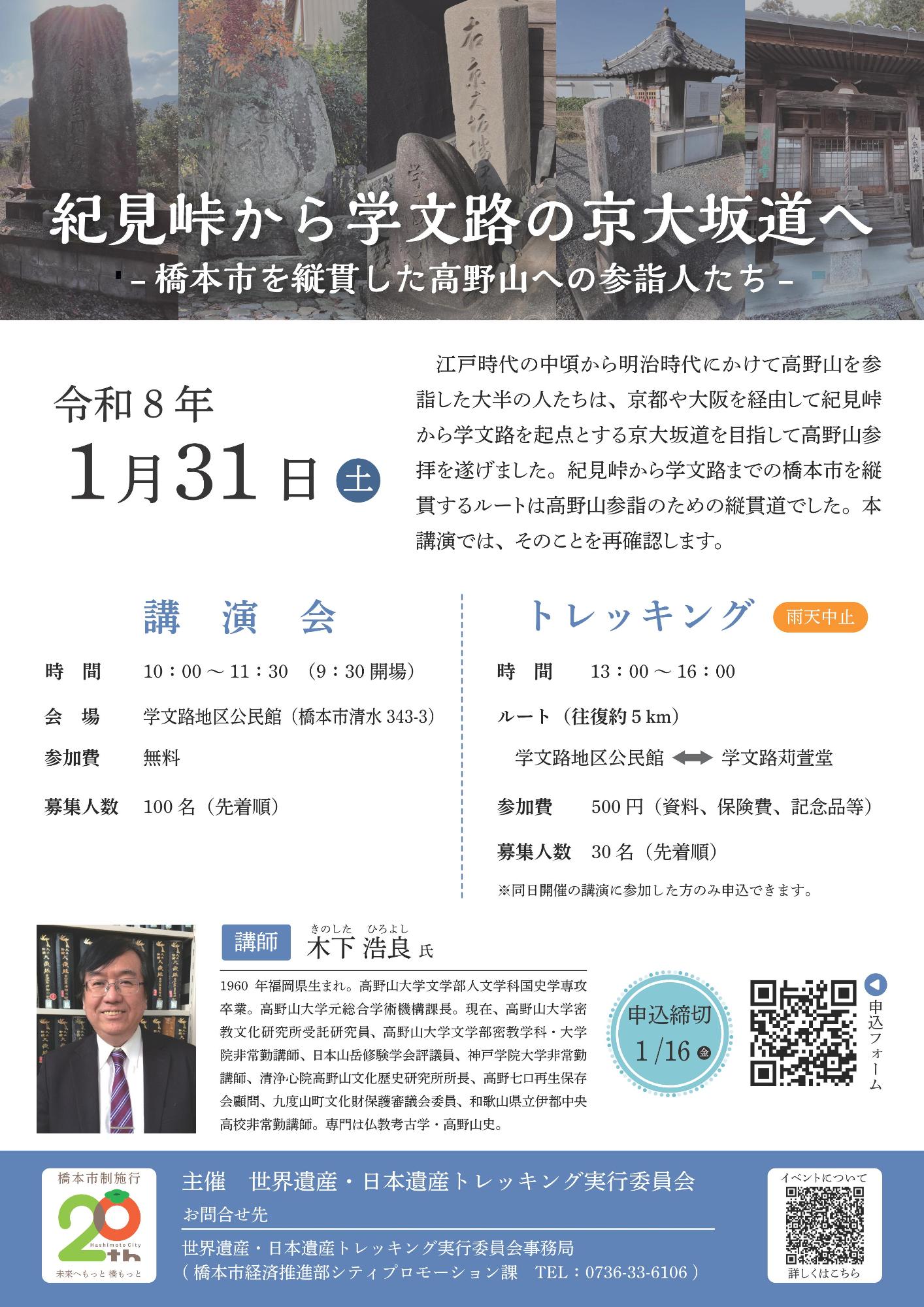 「紀見峠から学文路の京大坂道へ-橋本市を縦貫した高野山への参詣人たち-」講演会、トレッキングイベントを開催します!