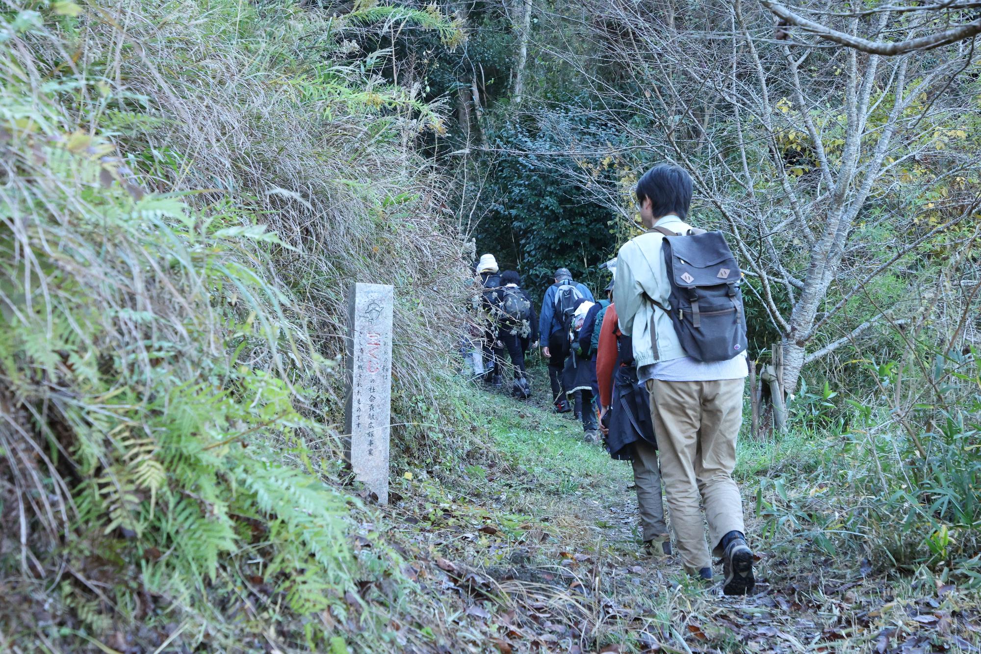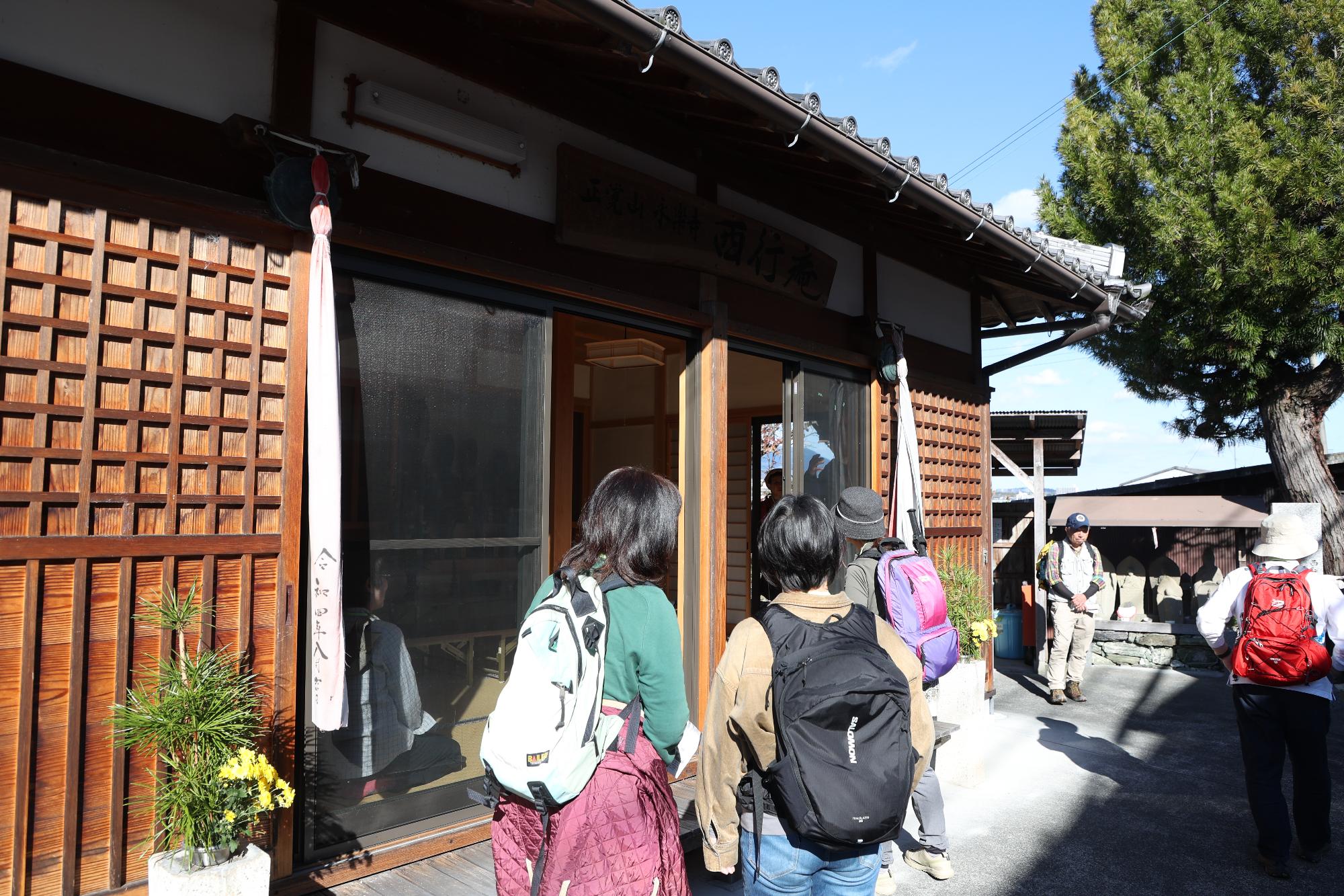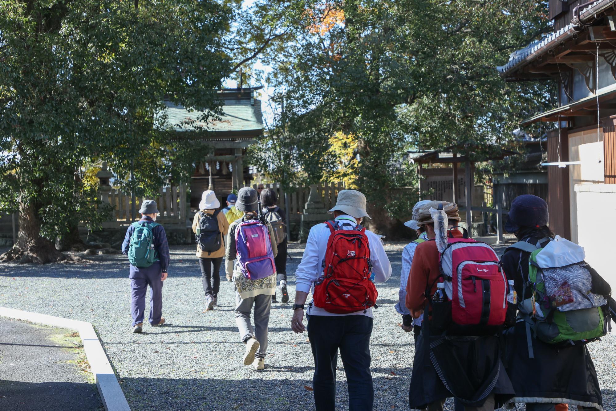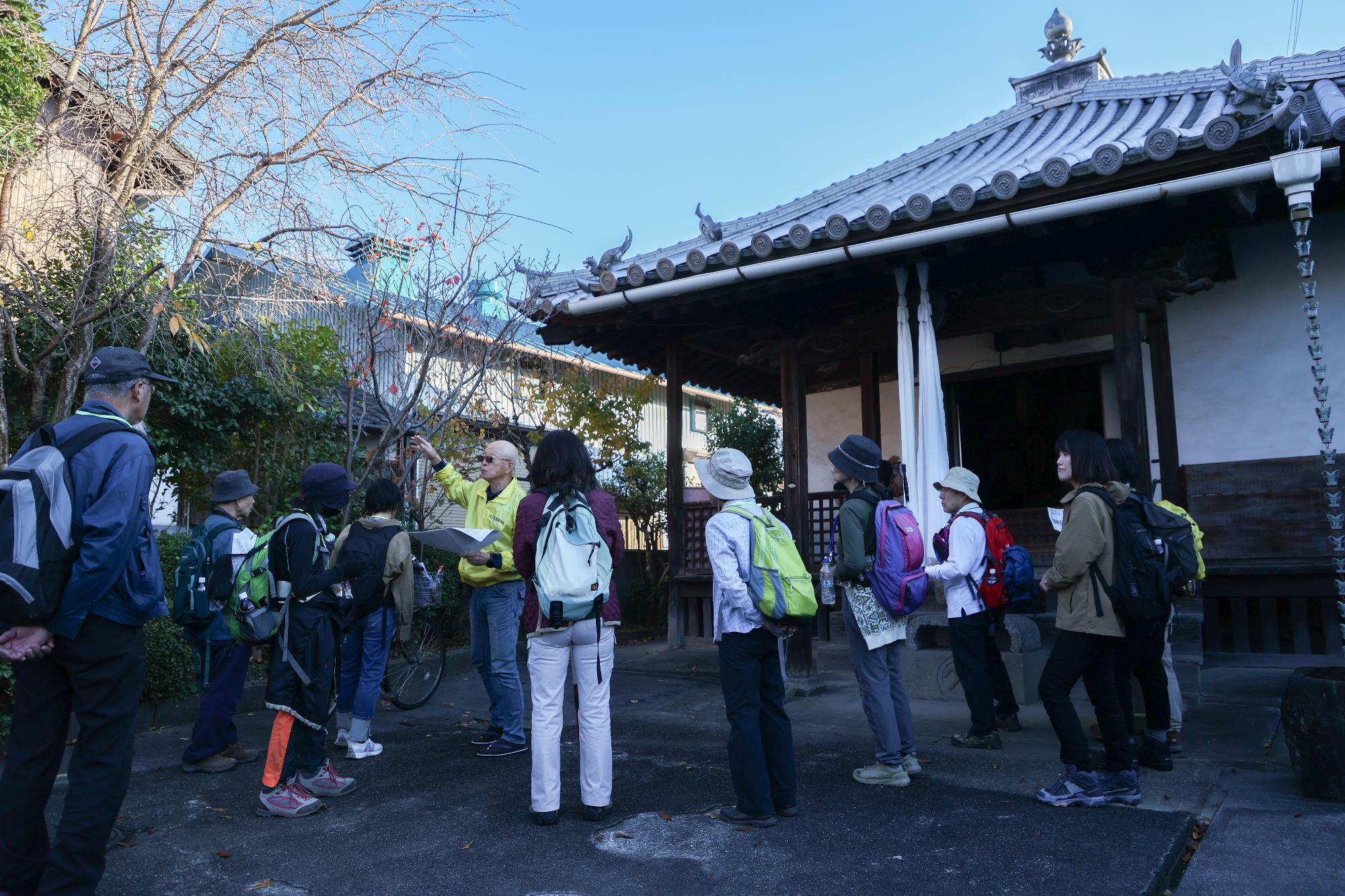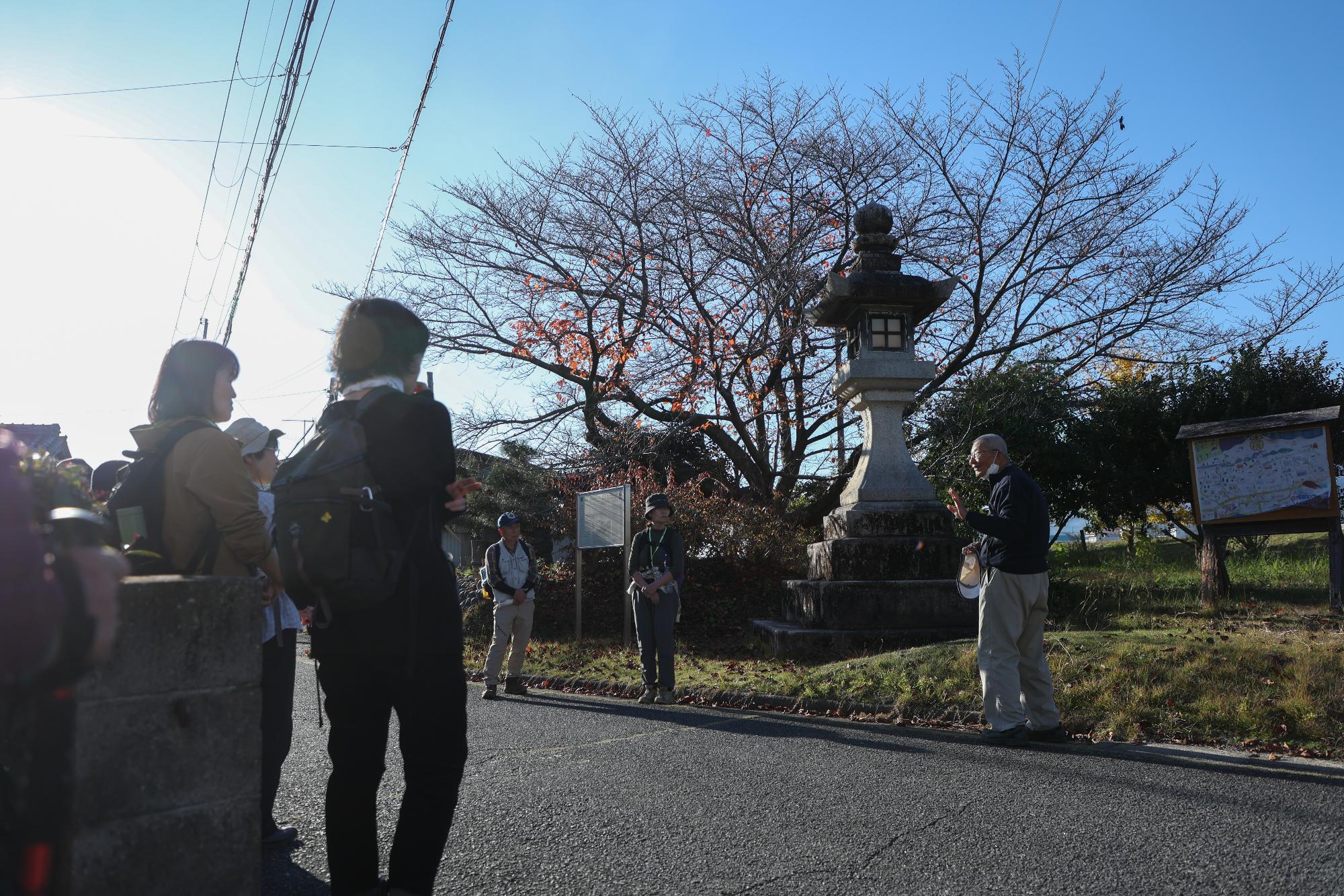 木下講師の講演は、参加者の皆さんがとても興味深く聞いてくださり、午後のトレッキングでは、社皇王神社や西行庵、定福寺など各所で見どころを紹介しながら五軒畑岩掛観音まで往復約6kmのコースを歩きました。好天に恵まれ、イベント日和の一日でした。