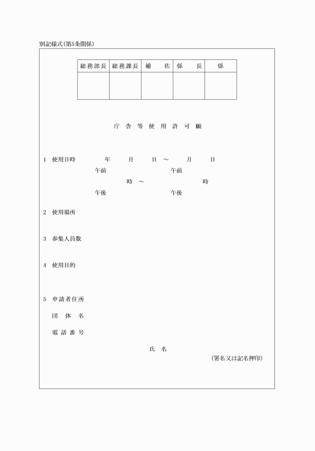 第5条 庁舎等において、次に掲げる行為をしようとする者は、あらかじめ庁舎等使用許可願(別記様式)により総務部長の許可を受けなければならない。
