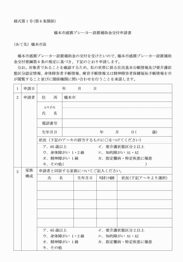第6条 補助金の交付を受けようとする者(以下「申請者」という。)は、橋本市感震ブレーカー設置補助金交付申請書(様式第1号)に次に掲げる書類を添えて、市長に提出するものとする。この場合において、申請者が自己又は同居の者以外が所有する家屋に居住している場合は、当該家屋の所有者又は管理者の承諾を得なければならない。
