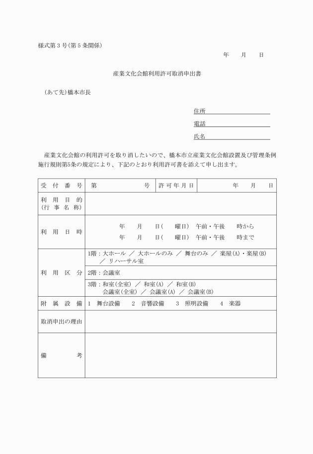 第5条 産業文化会館の利用許可を受けた者(以下「利用者」という。)が、利用を取り消したいときは、利用日の前日までに産業文化会館利用許可取消申出書(様式第3号)に利用許可書を添えて、市長に提出しなければならない。