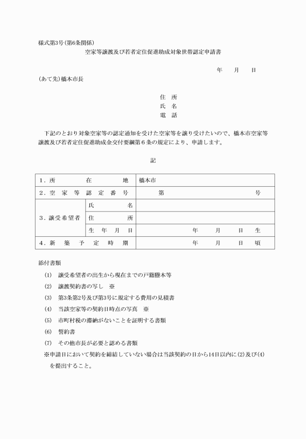 (1) 橋本市空家バンク制度要綱(令和2年橋本市告示第14号)第3条第7号ア及びイに規定する条件を満たし、空家バンク制度を通じて無償又は1万円未満の価格で譲渡される物件であること。